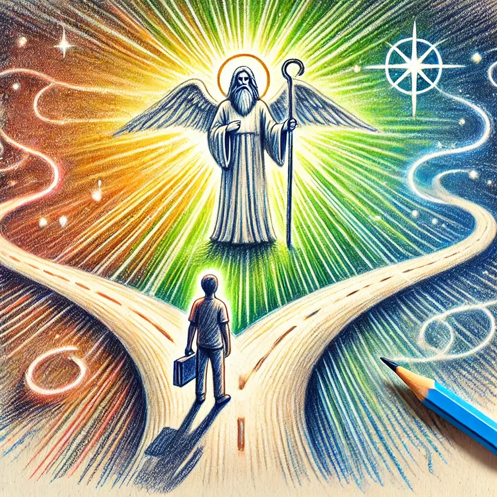 התמונה מציגה שביל שמתפצל לשני כיוונים, כאשר מצד אחד עומד אדם שמתלבט באיזו דרך לבחור, ומעליו דמות שמימית המכוונת את צעדיו באור רך. השביל המוביל מסמל את הבחירה האנושית, והאור המכוון את ההכוונה האלוקית שמלווה אותו.